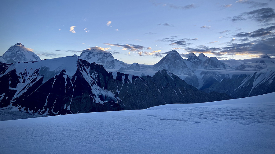 ▲ Panorama z Gongogoro La (5600 m). K2 (8611 m), Broad Peak (8051 m), Gasherbrumy: IV (7925 m), III (7952 m), II (8035) oraz Gasherbrum I (8080 m)